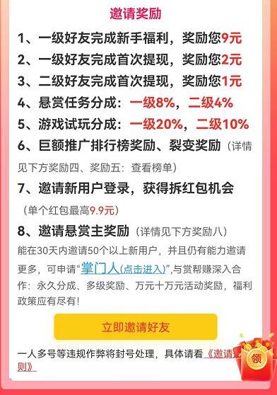 悬赏平台推广通常有提现奖励、排行榜、裂变奖励、长期提成等;以目前龙头平台赏帮赚为例,平均一个下级用户利润大概在4-6元左右,如果市场比较好或者直推裂变数量巨大,那会更高一些,另外如果当天推广人数少,利润就很明显会下滑,这点主要是因为目前市场优质任务不算特别多的有关,所以其实推广利润是OK的,但想躺赚不容易,要是每天推广比较多日入100不会太难,只是必须坚持,等市场更好的时候就能实现躺赚了!
