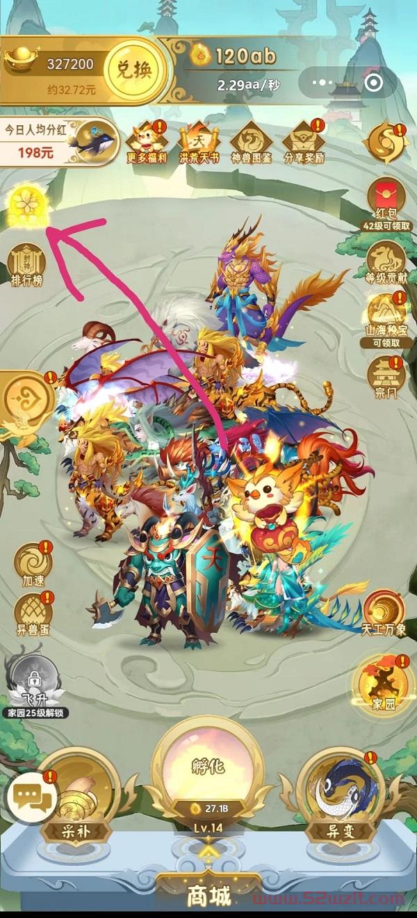 1、神兽合成每升一级就会得到一个红包(元宝),这个是小钱,边玩边领即可,最赚钱的是卖花和后期家园卖资源道具和果实等,后面会具体介绍,游戏首页每个按钮的功能如下图,看见带箭头的地方都可以点下,都有东西领。