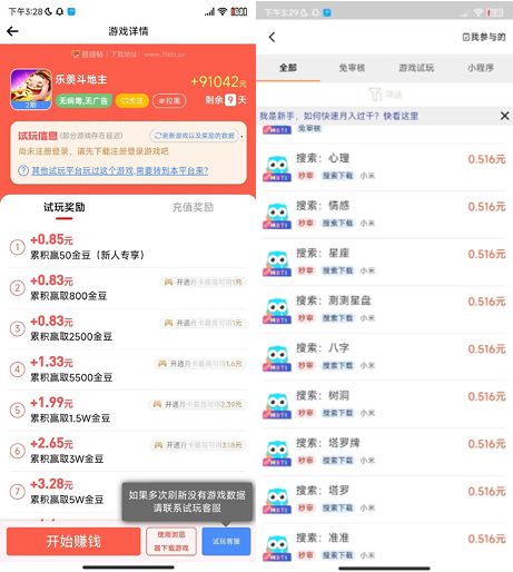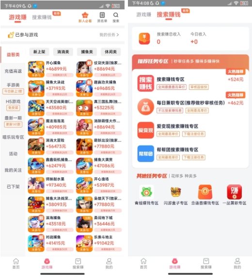 4、任务类型丰富。游戏类赚钱就有130多个游戏,妥妥的全网第一。这些游戏有休闲游戏、益智游戏、角色扮演游戏等。这些游戏都非常有趣,不仅可以让用户获得奖励,还可以让用户享受到游戏带来的乐趣。另外还有搜索任务赚钱区,在应用市场搜索APP名字,下载即可赚钱,任务数量也非常丰富。