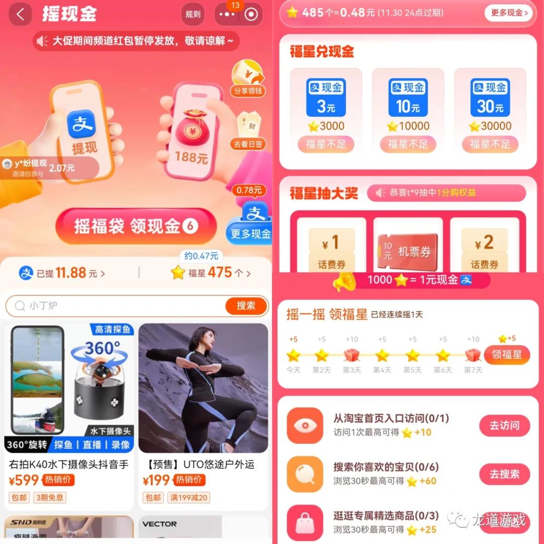 首页的中间是个摇现金页面,这个现金奖励是每天都可以领取的,并且去做福星任务积累到一定数量可以兑换现金,可以提现到支付宝。