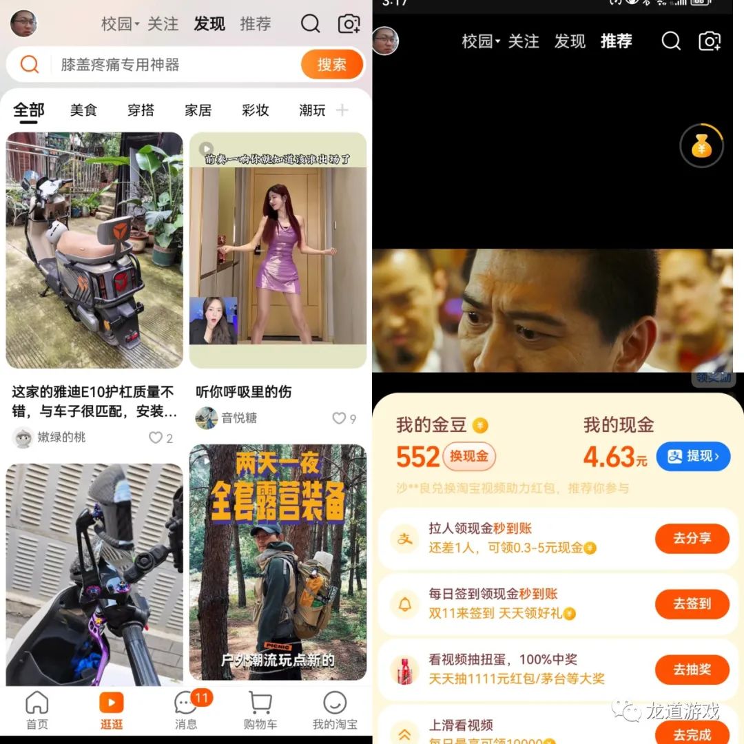淘宝首页下方导航键有个逛逛,打开之后右上角有个推荐,里边都是推荐的视频,看这个视频是有奖励的,也就是看视频刷金豆,每天可以提现三毛,当然你坚持每天签到提现还有大额提现奖励。