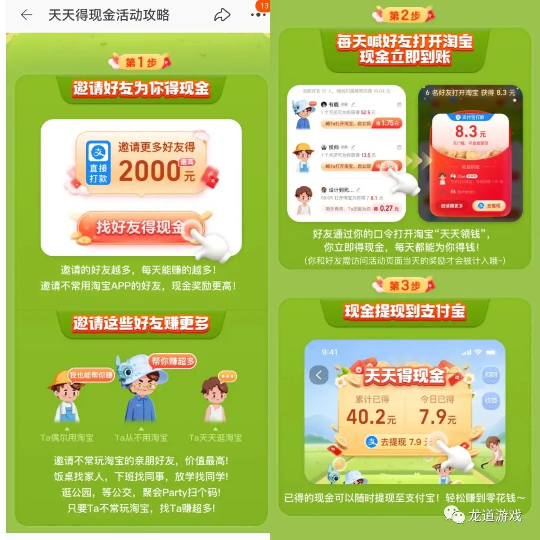 其实最厉害的还是这个淘宝助力红包活动,上图我们复制链接在微信里边打开需要跳转浏览器到支付宝才能打开天天领现金页面,当然保存图片直接用淘宝二维码扫码助力也可以,这个活动每天都可以参与,特别是邀请不是经常使用淘宝的用户给你助力你获得的收益越高,并且每天都可以进行助力。