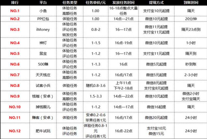 名单中有12家,基本也是目前发展稳定,靠谱的手机赚钱APP。今年的新平台没有一个在任务量,任务单价超过这些平台的。毕竟这行市场基本已经饱和,新平台除非有新的任务形式,才能生存。