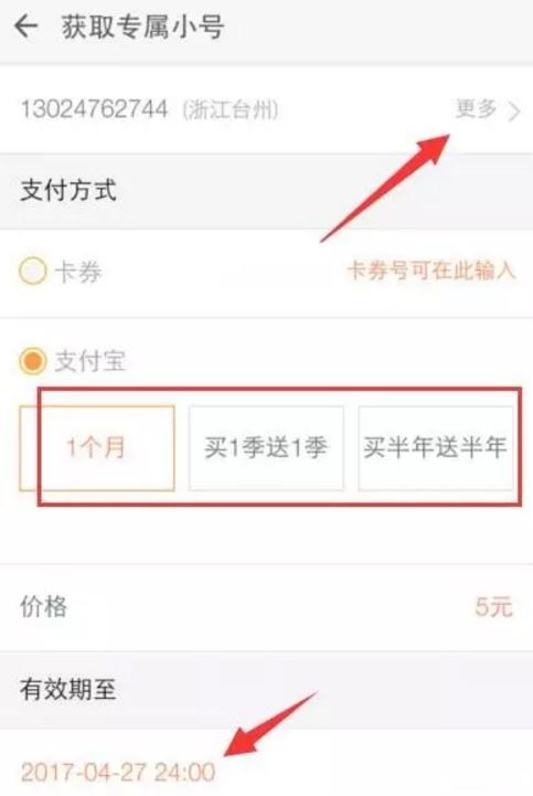 3、号码是随机的,可以点击更多进行更换小号。小号是需要付费的,1个月最少5元,1季度现在是12块,现在有优惠。
