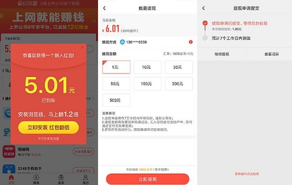 星球联盟APP是上市公司2345旗下的一款手机做任务赚钱软件,据说是2345王牌联盟升级改版而来。只要你通过在星球联盟APP上下载安装软件,阅读文章,分享,每日签到等都是可以让你赚到钱。目前新用户注册登录就送5元,连续活跃五天可提现1元,仅支持安卓系统。