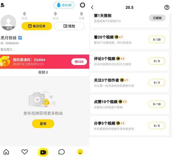 1、进入下载页面,复制邀请码:ZQXM4,然后点击下载芝士小视频App,注册时填写邀请码可获得20COS,每天享受分红,COS奖励记录可直接在“钱包”查看,后期赠送数量估计会下降,所以注册要越早越好。