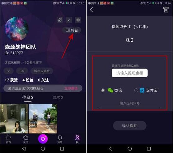 4、每日分红的现金可以在钱包申请提现,最低2元,支持微信零钱和支付宝。