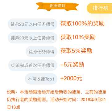 今天主要解读巨宝朋收徒赚钱系统,具体规则:徒弟20元以内任务师傅获取100%的奖励,徒弟20元以上任务师傅获取10%的奖励,徒孙任务师傅有5%奖励,徒弟首次任务最低奖励师傅5元。