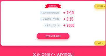 前三条规则的意思是:徒弟赚20元,师傅同样获得20元,徒弟收入20元以后的部分,师傅获得10%奖励,上不封顶,师傅还可以获得徒孙总收入5%的奖励,单就这几条来看,手赚界除了imoney爱钱没有其它任何一个平台可以与之相比,甚至与imoney不相伯仲。imoney老用户收徒奖励规则是:徒弟完成首个任务师傅获得2-10元,徒弟完成一个任务师傅获得0.25元,也是不封顶。俩个平台收徒奖励都不错。