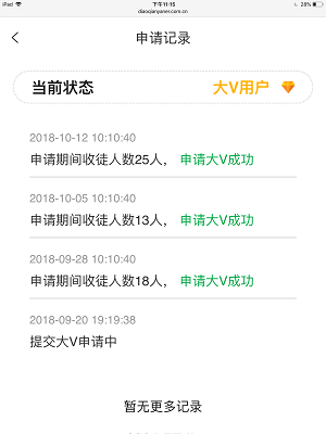 大V招募活动,新徒弟最高可为师傅带来25元收益。成功申请的条件:7日内邀请徒弟数大于等于10人,除名条件:连续1周邀请徒弟数小于等于5人。系统每周自动审核一次,符合条件者继续保持大V身份,不符合者剔除资格,如下图: