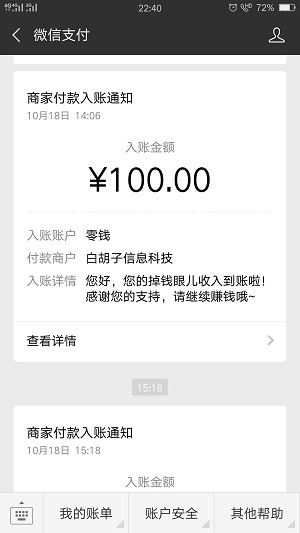 活动开启后,小编收益明显增长,昨日提现的100元于今日到帐,下面是收款到账记录:
