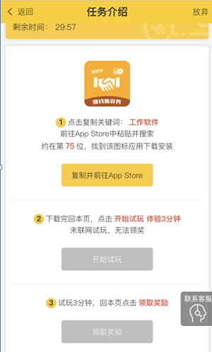 先在助手复制任务关键词,然后去app store搜索对应关键词,按照排名位置找到这个软件,如图标一致,说明找对了,直接下载安装,试玩3分钟奖励会自动打到你的账户里,满10元可以提现到微信。
