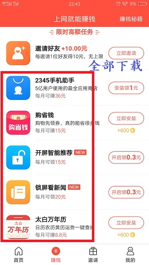 下载星球联盟APP可以领30元现金福利,当然不是直接给,需要按照要求完成任务。大家登录以后,第一部完善账号信息,该绑定的绑定,该填写的填写。下一步直接点击底部菜单第二项进入“赚钱”栏目,如下图所示,把限时高额任务全部下载试玩一遍,完成后,几块钱奖励到账。下载的这几款app不要卸载,以后每天使用还能继续赚钱!