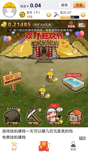 最顶部的现金可以通过抢红包获取,每个红包0.01元,加送10瓦力,也可以充值现金,现金可以用来升级矿机、矿工宿舍、购买奴隶、水池加水等。现金也可以直接提现,收1%手续费,官方禁止充值后无任何消费行为的提现。