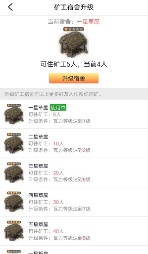 一级矿工宿舍只能住5人,住满需要升级宿舍,每次升级花费1元,奖励100瓦力,可以直接充值几块钱升级,挖矿设备每次升级也需要几毛钱到几块钱,价格都不贵,等级起来了,后面挖矿才快!