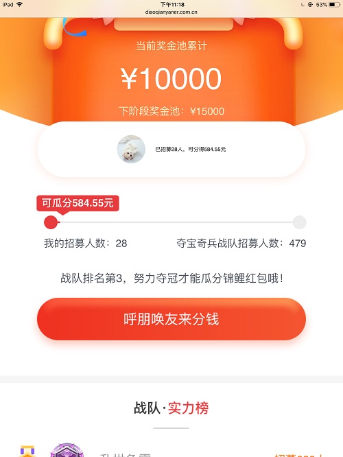 ②招募人数最高的获胜战队,每个用户按照个人给战队带来的招募人数比例,瓜分3个战队的奖金池内所有现金。