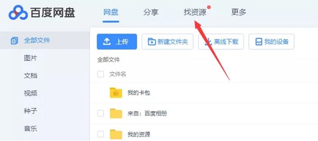 1、打开百度网盘首页,点击【找资源】没有百度ID的,需要提前注册一个