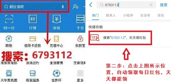 方法一:打开支付宝,在首页输入红包码:6793112,每天都能领取一个红包,金额最高99元,这个红包在购物、付款、点外卖....等有支付行为的时候自动抵扣,可以参照下图操作: