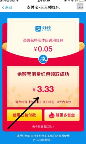 1、上图是小编领取的一个余额宝红包,接下来在需要付款的时候,先打开支付宝,点击“扫一扫”或者“付钱”,前者是主动扫描商家的收款码付款,后者是出示自己的付款码,由商家扫描后付款。