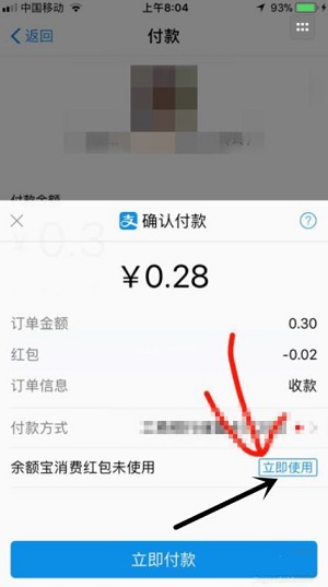 2、在确认付款页面的最下方,选择“使用余额宝红包/花呗红包/通用红包”,即可自动抵扣,一定要记得在最下方点“立即使用”,不然红包无法使用。