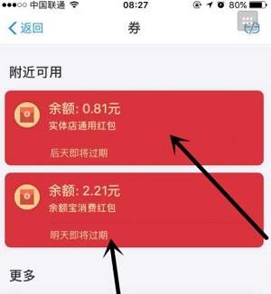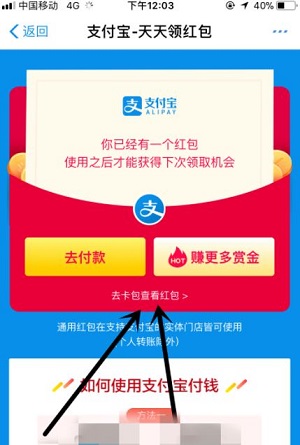支付宝领红包,但是有时候去领的时候,却提示“已经有一个红包”,这是因为昨天或者前天领的红包还没花出去,可以按照下图查看红包详细信息: