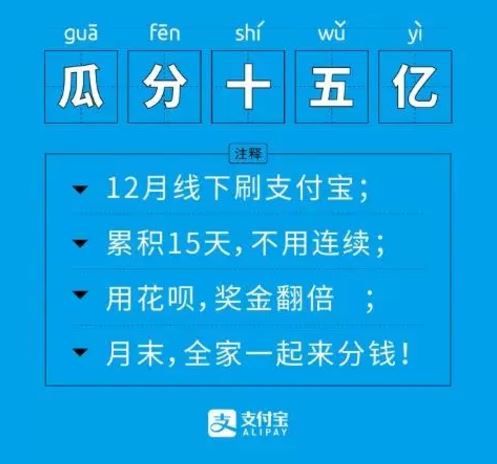 这是支付宝于今天最新推出的活动,小编第一时间发布,好让大家抢占先机!本月使用支付宝到店付款15天,即可参与瓜分15亿