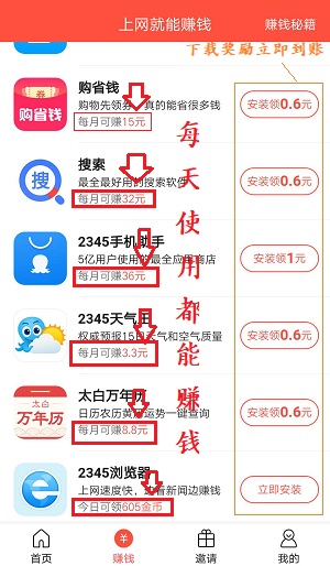 下载星球联盟app,下载注册之后即得6元现金,登录成功以后,点击“首页”—立即领取“2345浏览器”,下载安装2345浏览器,奖金为0.6元,还可以安装2345天气王、2345手机助手等,都有赏金。然后使用这些软件同样还可以赚钱,就比如说2345手机助手来说,每天签到就可以得金币,然后每天使用这些软件同样可以得金币。
