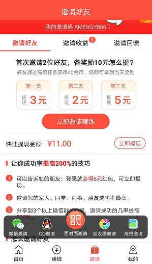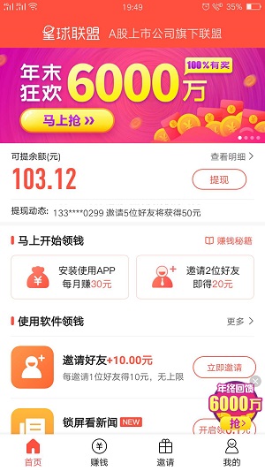 这个也是各种手机赚钱软件中比较常见的一种方式了,星球联盟的邀请奖励也是非常高的,首次邀请2位好友就可以获得20元奖励,不过是分三天发放的,比如第一天你邀请的好友通过高额任务获得40金币的话,你就可以得到3元钱,第二天好友在完成任务你可以得2元,第三天得5元,一共是10元,这个可以立即提现的。还有就是当好友完成任务的时候还可以获得好友任务的30%金币奖励,可以说奖励还是非常丰厚的。
