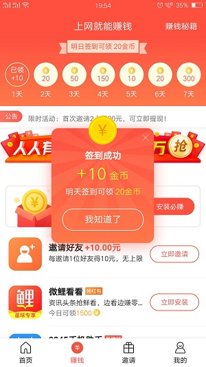 登录星球联盟app以后,在赚钱一栏里面有一个领金币的任务,点击签到之后就可以领金币了,连续签到也是以递增的形式上涨的,比如说第一天签到10个金币,第二天20个金币,第三天50个金币这样。