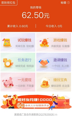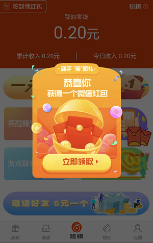 第四种,签到赚钱。在橙赚APP上每天都能签到,每次签到都能获取一个红包。如果连续签到30天就能抽取最高666元的大红包。
