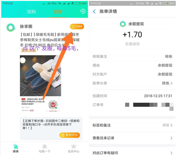 新用户1元秒提现。现脉享圈升级2.0版本后提现难度加大,主要是提现时间不再那么随意,隔一段时间才能提一次,同时第二次提现之前必须邀请5人,依然是支付宝秒到账。