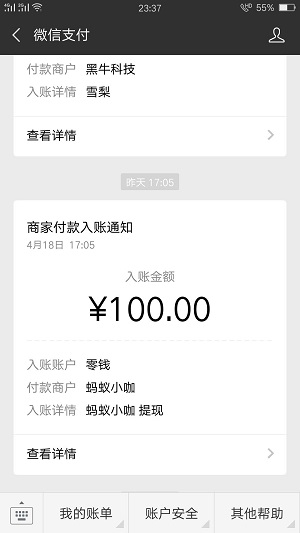 这个平台也是10元就可以微信提现,无手续费,但是一天只能提现一次,必须前一次提现到帐后才可以再次申请提现,这就出现一个问题,有时候节假日提现好几天没人处理,账户余额只能堆积着,等下周再提现。但是都会到账的,大家也不需要担心。