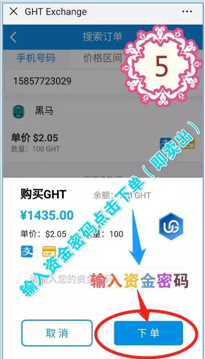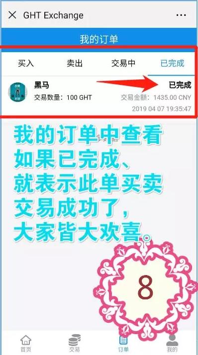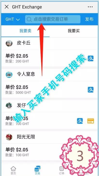将糖果从趣步转到GHT之后。私下谈好价格,买家去交易所发布买单,卖家去搜索买家手机号,输入资金密码下单,等待买家付款,收到款后发送糖果给买家,完成交易。