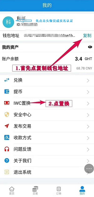 3、在个人中心先点击头像实名认证,一定要认真填写。大家都是为了卖糖果而来,发布卖单方法:复制顶部头像下钱包地址-点击IWC置换-输趣步账号密码-将糖果转至GHT平台,需要一笔交易手续费,小编转出100糖果,扣了25%手续费,实际转出125个。新手手续费比率更高,通过收徒可以增加趣步贡献值,从而降低手续费。在GHT个人中心发布交易就行了,有人接单并转账后,及时登录平台发货,交易完成。