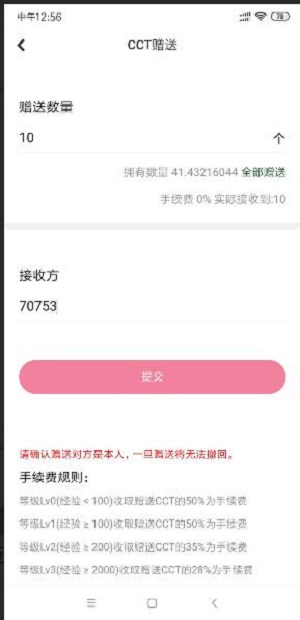 在APP内部点击“CCT”,点右上角的“赠送”,输入对方手机号码或者链信号即可转账。