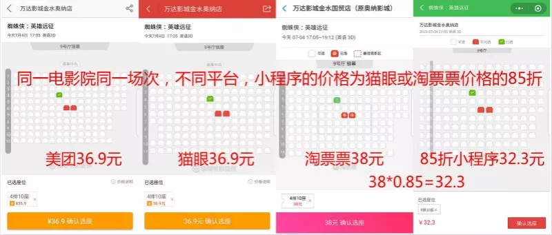 总之比美团猫眼淘票票都要便宜(美团抵扣券抵扣的,首单购票优惠活动的除外)。
