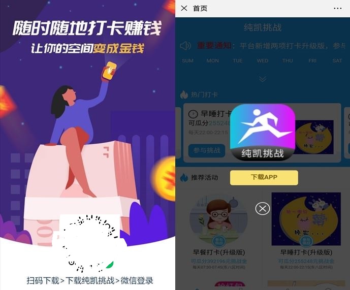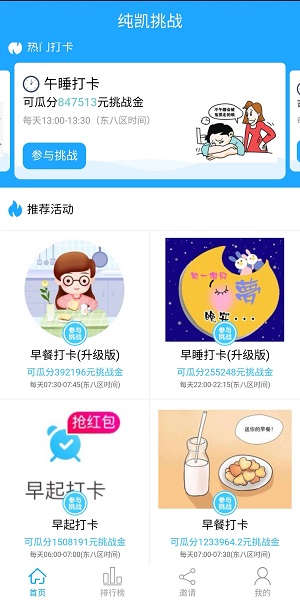 纯凯挑战为用户提供了打卡赚钱模式,早起打卡、睡觉前打卡、运动打卡、喝水打卡等。