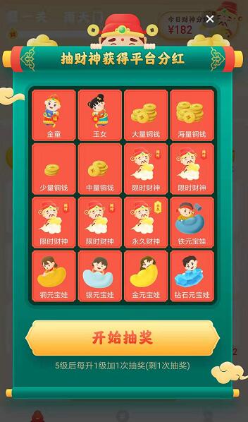 小红淘app是合成玩法,吉祥物没有等级上线(无限级)。现在拥有的吉祥物最高等级为40级。静态收益有限时财神分红,金童玉女分红88元。静态财神有限时财神和永久财神,分别为: