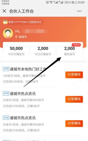 3、通过菜单“点我赚钱”可查看金币到账情况,分享里面的资讯也可以赚金币。点击金币,到提现页面,根据提示操作即可。