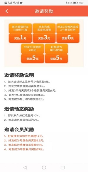 帮小咖还有一个可以每天领钱的地方,那就是“摇钱树”功能,首次点击下下“摇钱树”就可以获得0.2元的奖励,激活后每天点一下就可以轻松领钱了。摇钱树里面共有四种身份:长工、佃户、地主、土豪,根据用户完成不同数量的悬赏任务,或是邀请好友的数量,获得不同的身份,领取的收益也不一样。最高级别可以领取2160元!此外还有高邀请好友,邀请不同级别的好友还可以获得奖励!最高级别土豪可以还可以赚到无限广告分红收益!月入万元不是梦!