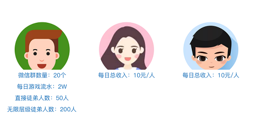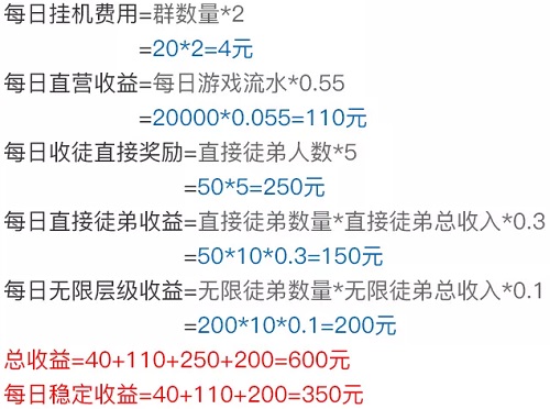 无限代理的无限层级徒弟收益=直接徒弟收益(包括徒弟的游戏收益)*40% 无限层级徒弟收益*10%。