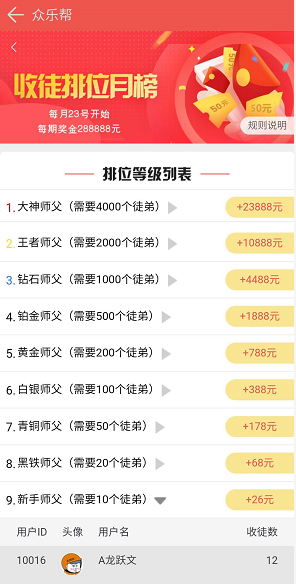 除此之外,众乐帮还有邀请好友瓜分288888元现金榜单,目前还有很多榜位是空着的,现在开始给自己定个小目标,每天邀请十个人,相信不久之后,推广排行榜中就可看到你的名字了~