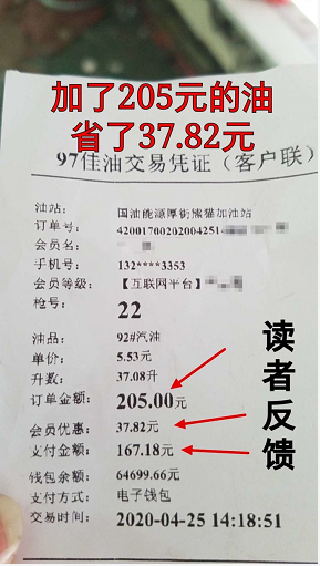 我们先来看看一位车友给老段反馈的加油信息,对比用了淘油集加油和没有用淘油集加油的价格!