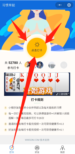 而今天老段要讲的是一款名叫:习惯早起的微信小程序,每天有20次打卡的次数,每次可以获得1健康币,1健康币=0.01元,说白了就是看广告,每看一次广告得1个币,30个健康币就可以提现!