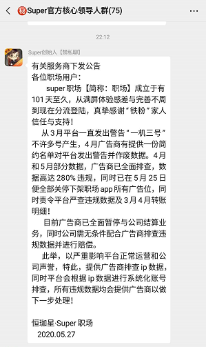 超级职场是一款合成 悬赏的平台,老段也有发玩法教程,当时本以为是一个零撸的好项目,毕竟光看广告一个月单撸94元,索性就发出来了,4月底开始玩的职场,本以为5月的15号职场提现结算会到账,谁曾想官方一个通知,无限延长了到28号结算,也就是昨天,延长就延长了,可大家千等万等,等来的又是官方的另一个通知,潜意思就是提现到账不了了,作弊的人太多了