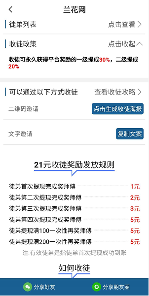 除此之外兰花网收徒收益50% 21元收徒奖励红包!