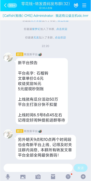 当然你还可以选择加入咱们零花钱的转发平台首码发布群,只要一有新平台上线,老段会第一时间发布到群里面~