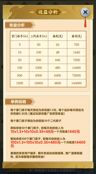 3.收徒奖励,徒弟每天预估1.3元,徒孙每天预估0.35元,适合动态推广玩家
