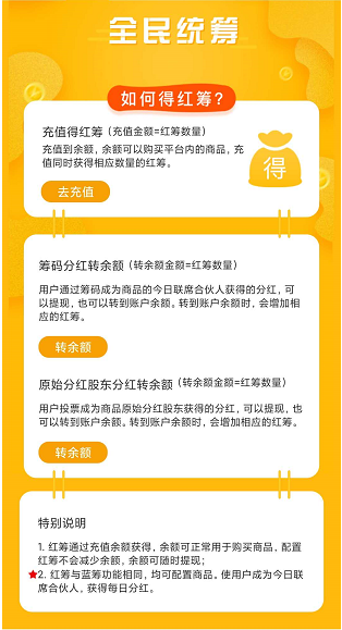 红筹:充值送红筹,余额可以购物,余额可以随时提现(充值比例是1元:1红筹)