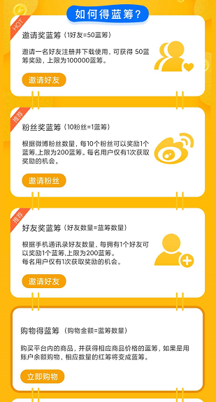 蓝筹:邀请好友注册并且登录APP送50蓝筹,上限10w,粉丝好友等都可以获得蓝筹